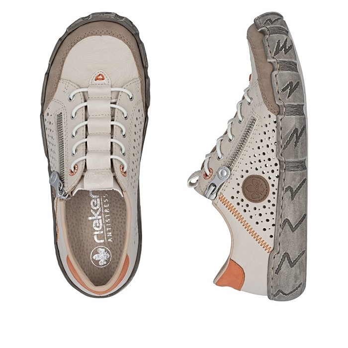 Favoris de tous les temps ! Ces chausures Rieker beige en cuir lisse pour femme concilient tout : confort, fonctionnalité et bien-sûr style. Cette chaussure est particulièrement durable et flexible. La fermeture éclair permet de les enfiler et de les enlever facilement. La semelle est légère et absorbant les chocs chouchoute les pieds à chaque pas. De plus, la semelle de propreté est extra douce. Vos meilleurs compères pour la nouvelle saison !