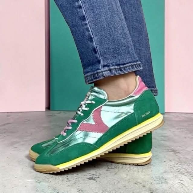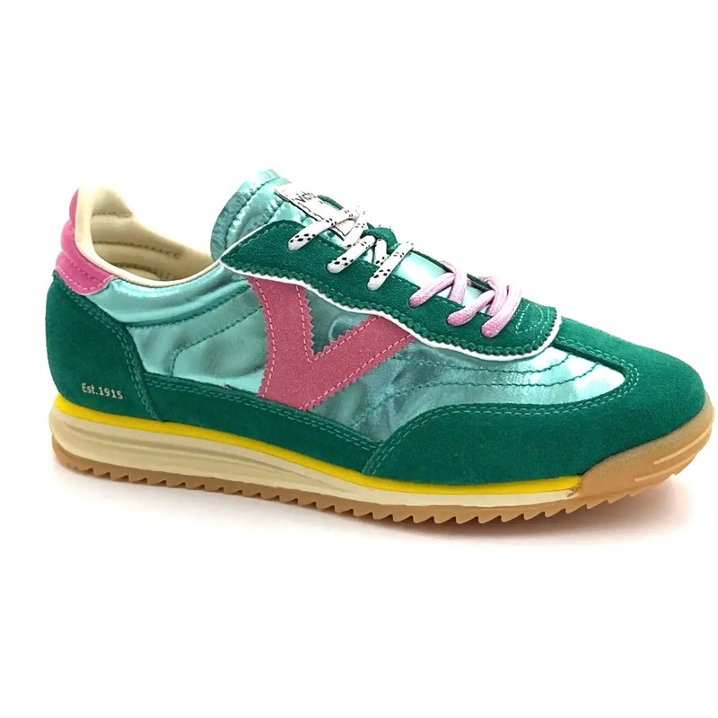 Sneakers pour femme fabriquées en nylon métallisé avec des empiècements superposés en daim. V latérale de victoria en contraste assortie à la pièce arrière. Fermeture par double lacet : tous deux ronds avec motif ton sur ton. Semelle bicolore en caoutchouc avec patin cranté en EVA couleur caramel.